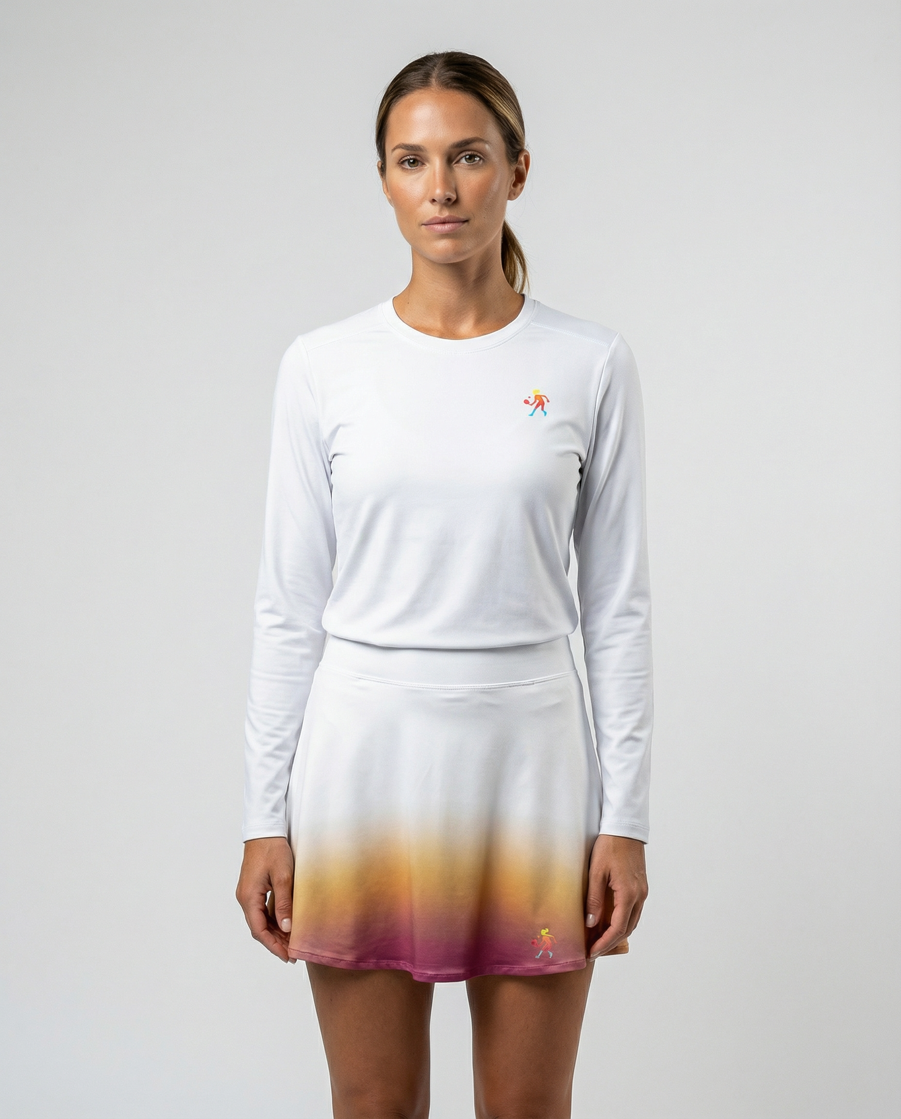 Serve, spin, and shine in the après-pickle Flared Pickleball Skirt. Designed for movement and confidence, this skirt blends athletic performance with an easy, flattering fit. The flowy pleated design adds style on and off the court, while the built-in shorts provide coverage and comfort through every match. A hidden pocket holds your pickleball securely, and UPF40 sun protection helps keep you safe during long days in the sun. Lightweight, breathable, and versatile, it’s your new match-day essential.